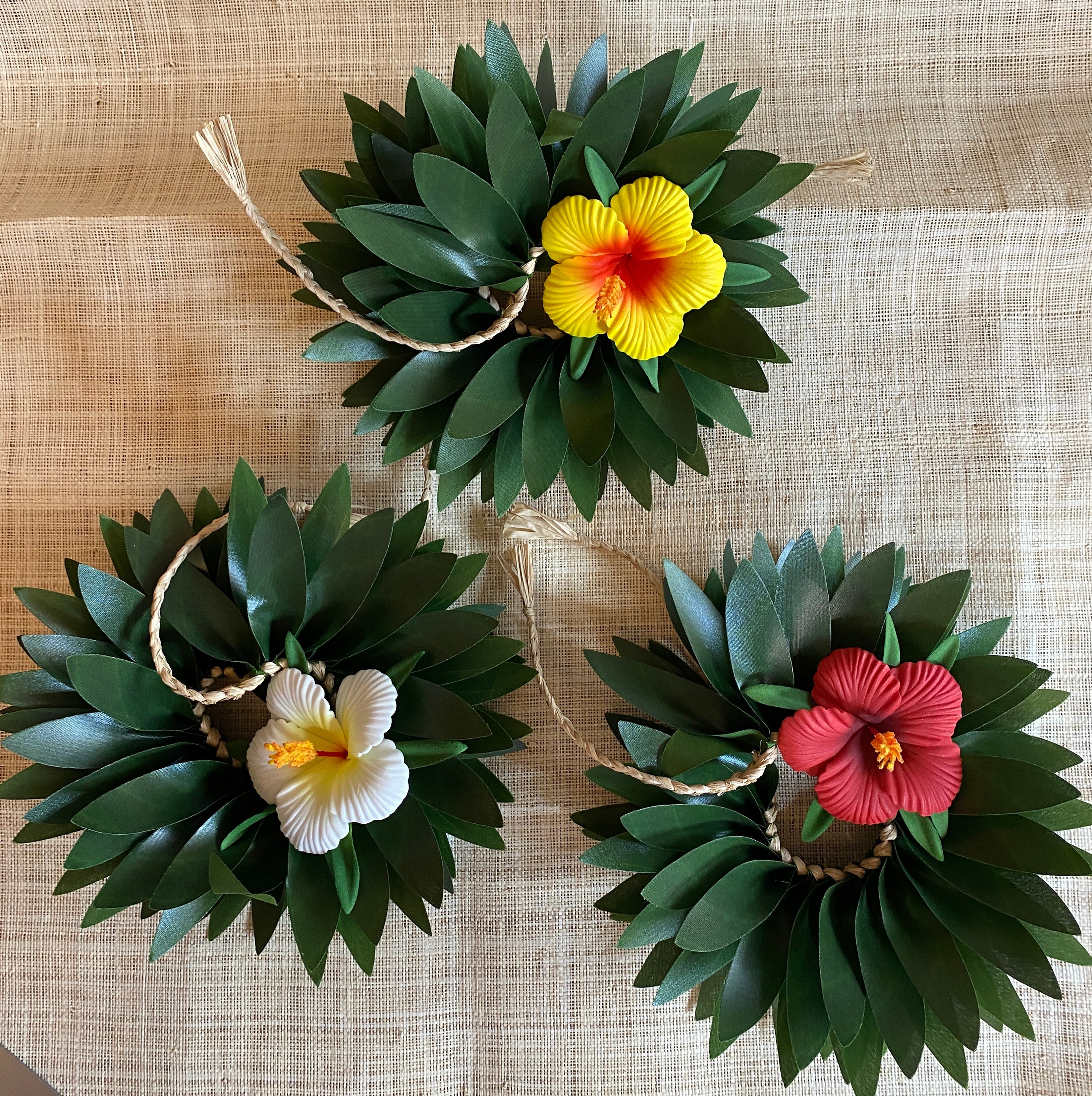 Silk green leaves with raffia and artificial hibiscus flower in white, yellow or red. About 7 inches long. Hair bun or wristband. Color is slightly different due to lightening. Please message me for any questions. Mahalo!
