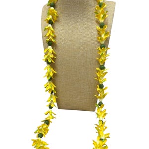 Hawaiian lei made with dark green and yellow artificial silk leaves, lauhala strips and lauhala balls. Color is slightly different due to lightening. Please message me for any questions. Mahalo! About 17 inches long.
