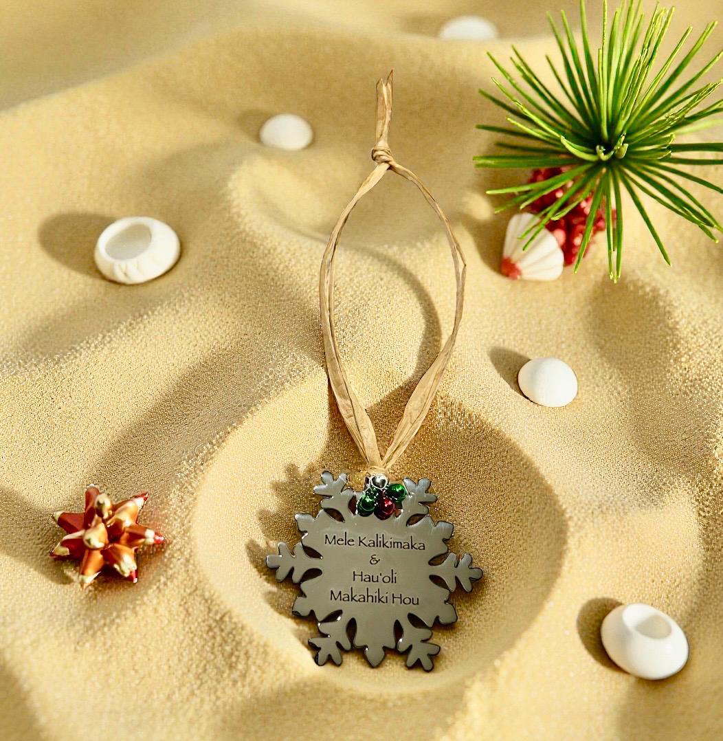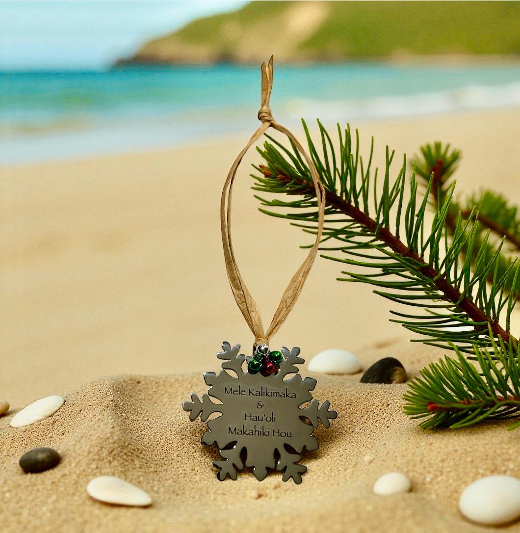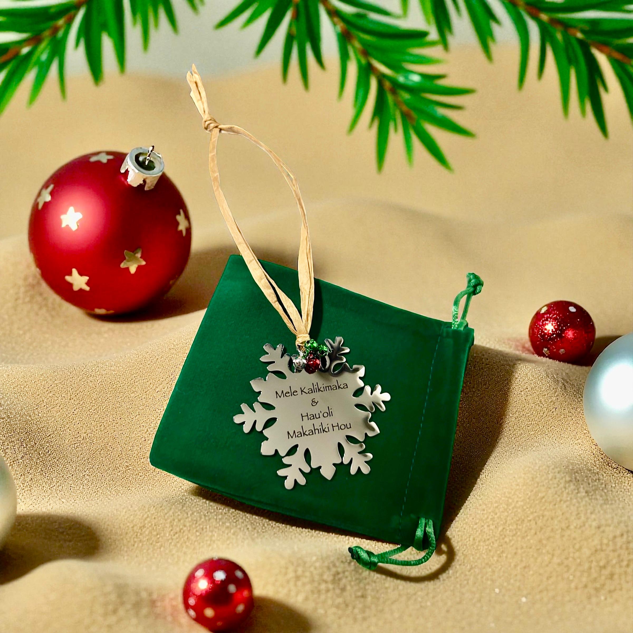 High quality stainless steel 72mm x 72mm laser snowflake ornament. Green bag included with ornament. "Mele Kalikimaka & Hauʻoli Makahiki Hou" is the Hawaiian phrase for "Merry Christmas and a Happy New Year".