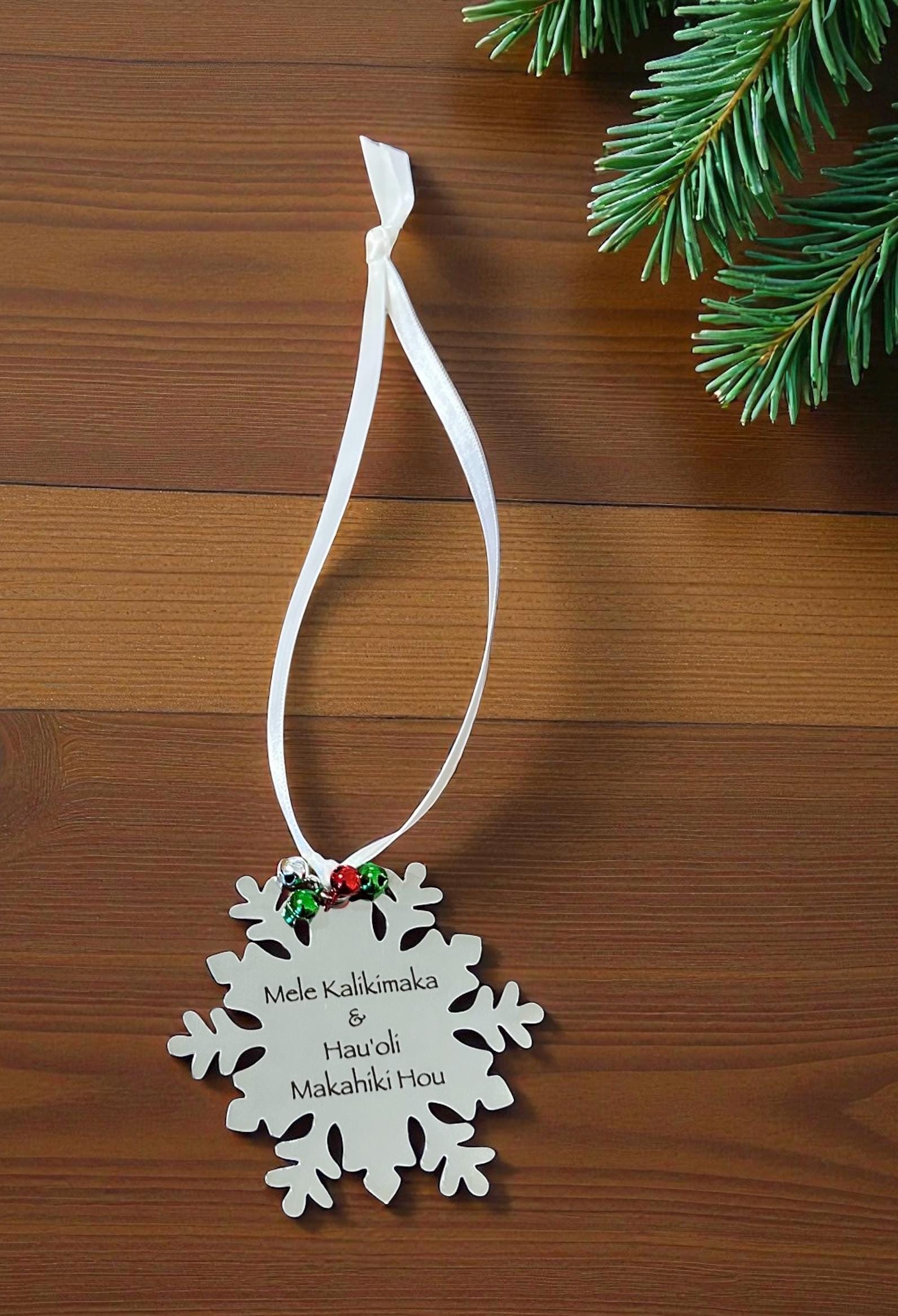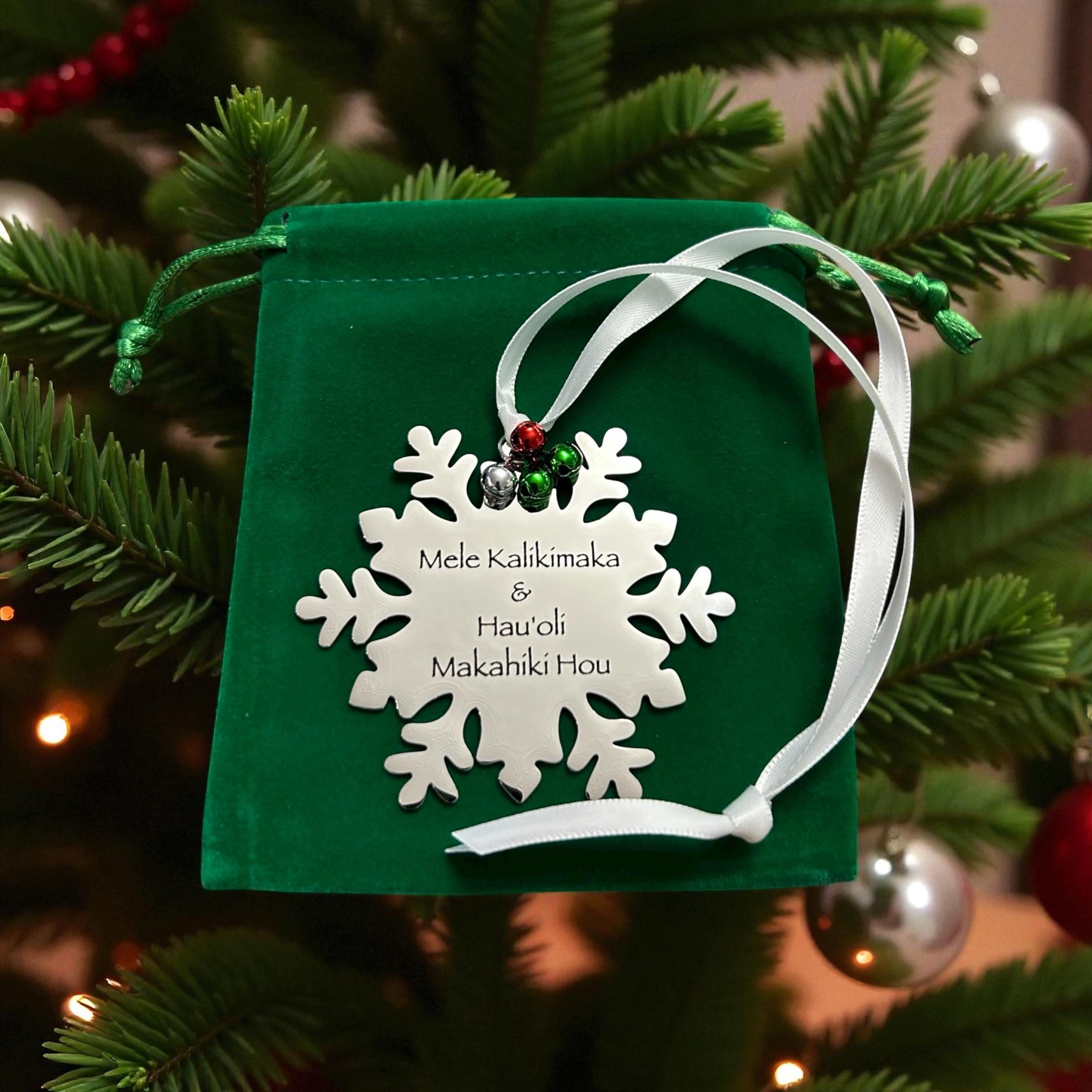 High quality stainless steel 72mm x 72mm laser snowflake ornament. Green bag included with ornament. "Mele Kalikimaka & Hauʻoli Makahiki Hou" is the Hawaiian phrase for "Merry Christmas and a Happy New Year".
