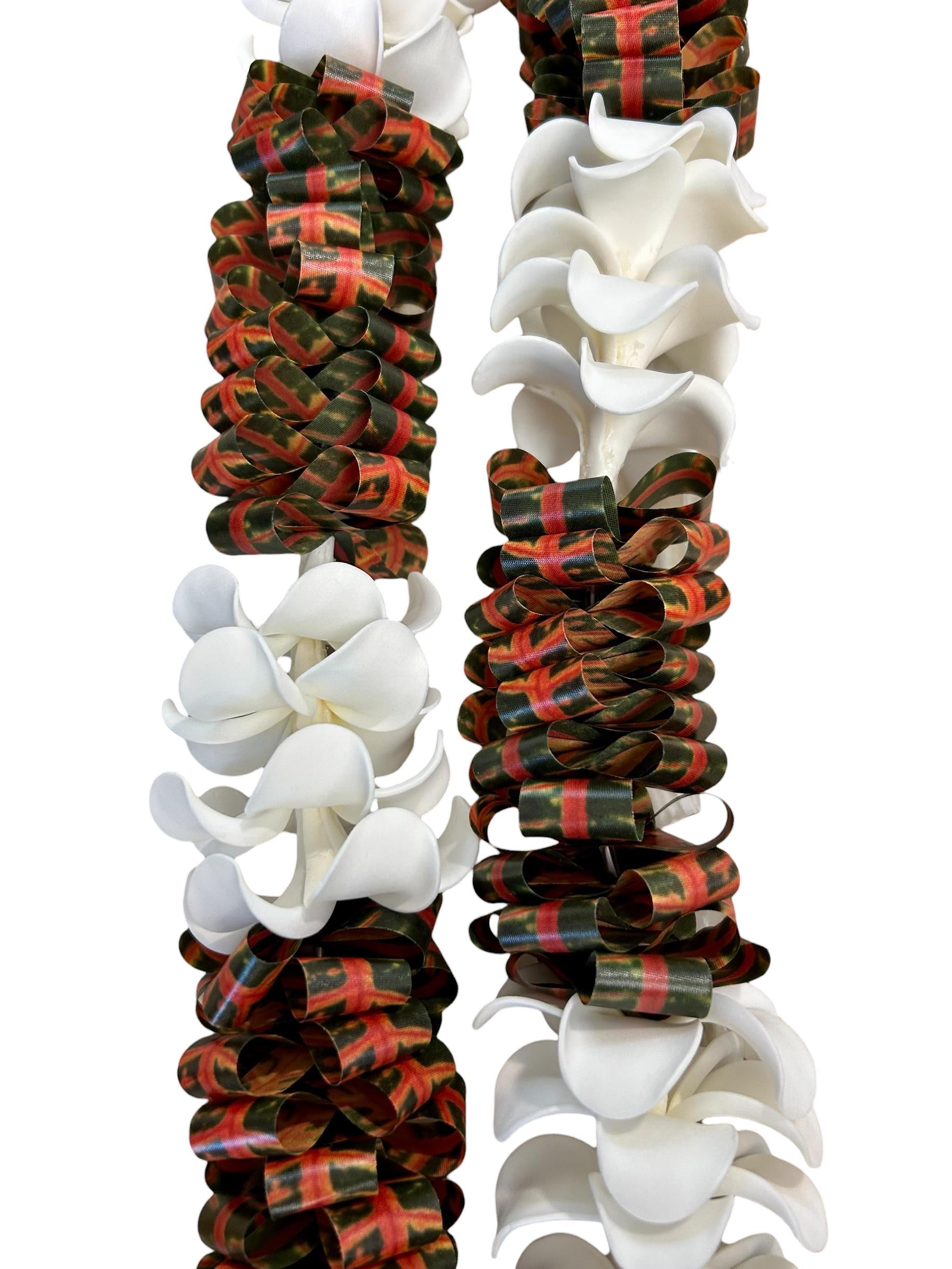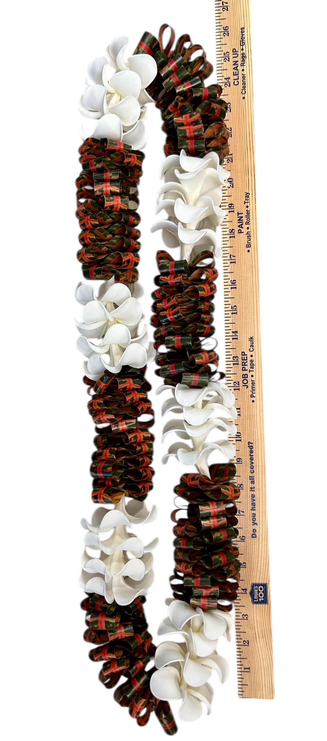 Hawaiian artificial lei made with foam 2.75 plumeria flowers and croton leaves lei. Color is slightly different due to lightening. Please message me for any questions. Mahalo!
