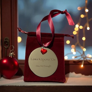 High quality stainless 60mm x 60mm laser snowflake ornament with hibiscus charm. Dark red bag included with ornament. "Ua ola loko I ke aloha" is a Hawaiian phrase that translates to "Love gives life within".